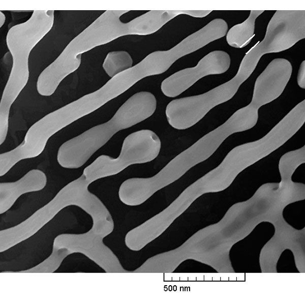 The various spacings created by the dendritic structure of this specimen are suitable for performing point resolution tests and the topographical arrangement of the dendrites for a grey level test. It is non-magnetic, vacuum clean, has no adverse reaction to the electron probe, requires no surface coating and is most useful for working in the probe size range of 25 -75 nm. Supplied unmounted, it can easily be attached to a stub using a conductive adhesive such as silver paint.