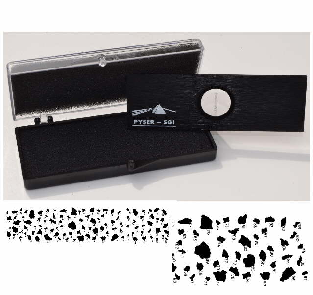 SG7 Particle Analysis Test/Calibration Slide. Microscope slide with 200 particles of various shapes and sizes. Each of the 200 shapes is numbered so that comparison can be done with particles in the specimen, and the details logged and communicated. Is also a useful tool for calibration and operator training. For pattern size details SG7-Particle-Analysis-Test-Slide. Now available with Type Test report that gives size and area information of all 200 particle shapes